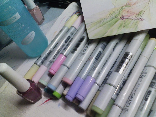 淡いピンクと紫と灰色でお衣装を塗ったのですが、このリヒトのせいでピンクの在庫がなくなりました。元々色のついている紙に塗ったので、いつもと同じ色が少しだけ違う表情をくれました。